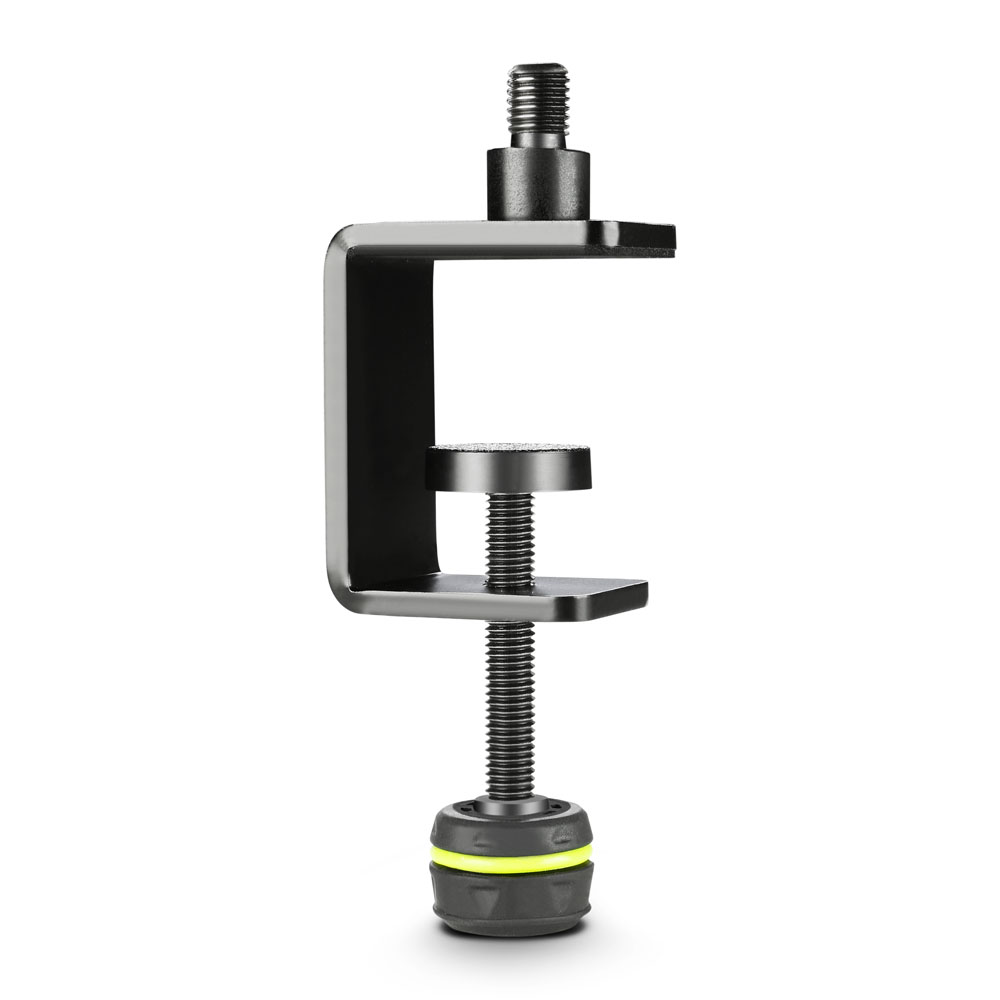 La pince table pour microphone Gravity MSTM 1 B se fixe sur toute table ou bureau d'une épaisseur maximale de 45 mm. Elle est en acier de 4 mm d'épaisseur et possède un filetage au pas 3/8è de pouce pour montage d'une fixation micro ou d'un col de cygne. L'extrémité plastique de la vis de serrage à molette évite toute rayure.